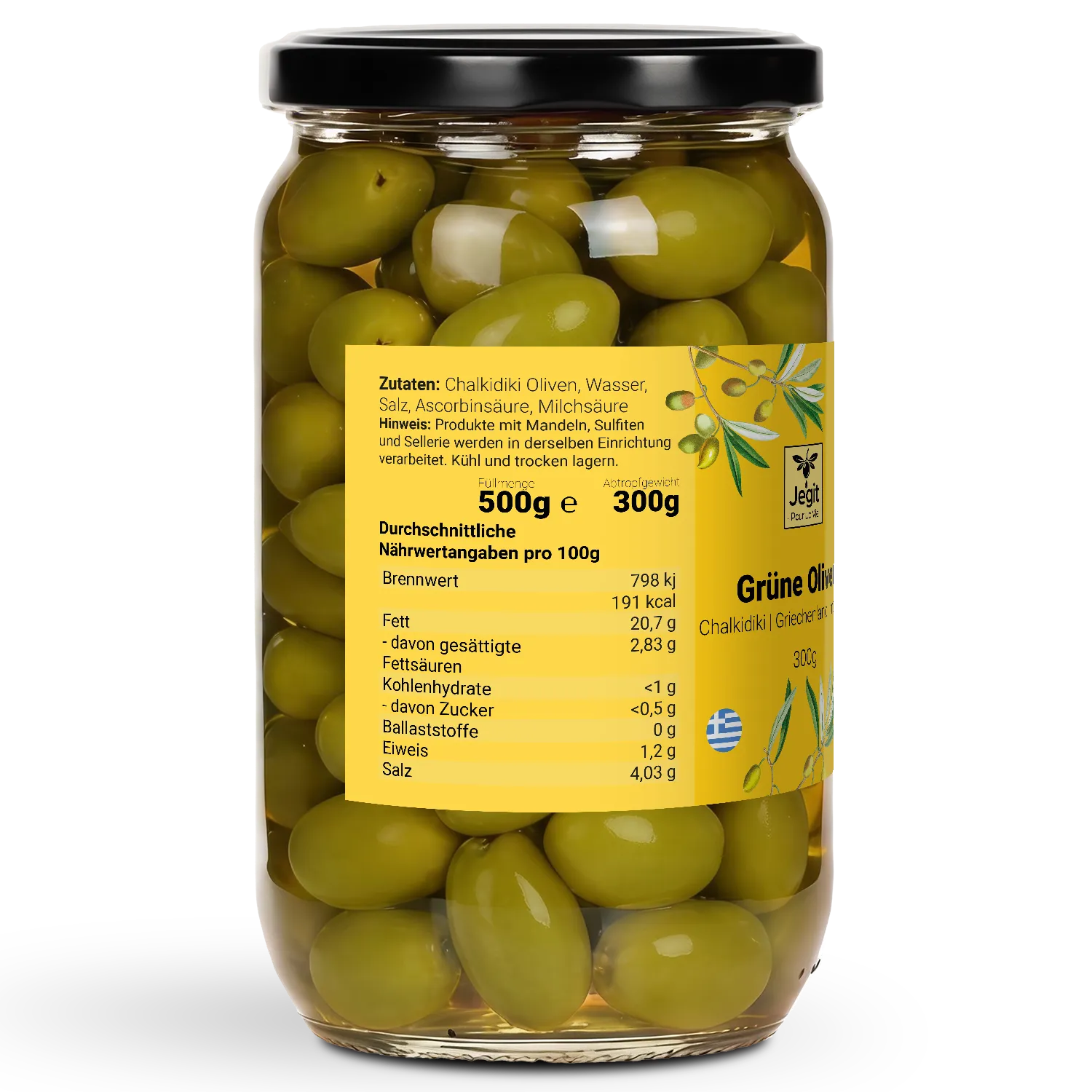| Zutaten: | Chalkidiki olives: 60% Water: 36% Salt: 4% Ascorbic acid Lactic acid |